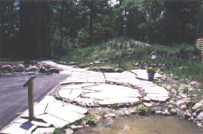| Local granite flagstones, retaining walls, boulders and plaques adorn the premises because they are environmentally responsible, beautiful and will last hundreds of years. (Photo taken of pavers in front of the Eco Domes.) |