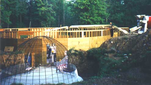 | This walk-in cooler was designed by Dennis and David Winkelman. This energy-efficient natural refrigerator is kept cool by the earth. The humidity and temperature are controlled with adjustable ventilation and the steel substructure acts as a Faraday cage in screening out cosmic radiation. (Photo of steel substructure in front of main dome foundation). Root Cellar building information is available through Eco Domes Conservation Campus. Phone 1-800-944-3764 or 1-218-764-2321 |