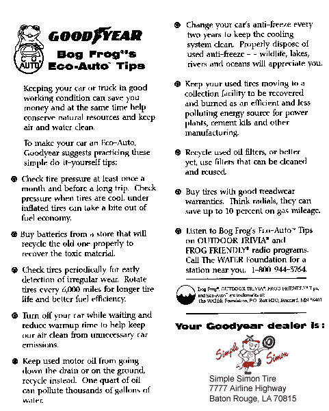 behalf of the environment. “At Johnny Wheels, we practice what we preach because we’re on the water three days a week!” says owner T.R. Storms Jr., who is a member of the local Bass club. “Everyone affects the water whether we realize it or not, because the pollution we generate eventually goes into the water somewhere. Exhaust fumes rain down from the sky, auto fluids run into the sewer and landfills eventually get full. More consumers are into conservation at a basic level than we realized, so we gave them several ways to help their environment by Reducing, Reusing, Recycling and Retreading at our stores. We also worked with the local schools, hosting Eco-Auto Tips classroom segments, Bog Frog coloring contests, and conservation “clue cards” were handed out which are designed to bring people back into the stores for free merchandise or service. The results were excellent! Our community is a better place and our customers are showing their appreciation with their wallets!” Conservation Pays!™ is the slogan of The WATER Foundation’s Eco-Auto programs that Goodyear sponsors hundreds of radio stations across America, as well as provides for Goodyear dealers in a free Eco-Auto kit by calling the co-op Hotline number (800 628 5050). By definition, an Eco-Auto is a fuel efficient vehicle in good working order. Through preventive maintenance, proper tire selection, inflation, balancing, regular tune-ups, swift attention to problems and recycling of its fluids and parts, Eco-Autos will last longer, run cleaner and save their owners money. For 1999, Goodyear has created a captivating new Eco-Auto poster for retailer showroom areas, as part of the free kit. According to David Winkelman, President of The WATER Foundation and creator of the Eco-Auto program, “This type of cause-related marketing is leading the way for automotive businesses to be more responsible and successful in the 21st century. Goodyear dealers are in an excellent position to increase their profits from conservation services for their customers and in their own operations. Why wait until you are legally required to provide these services? By leading the way for conservation now, you deserve greater profits and research has shown that your community will reward you in many ways!” The WATER Foundation offers more good conservation information on its website “www.bogfrog.com”.